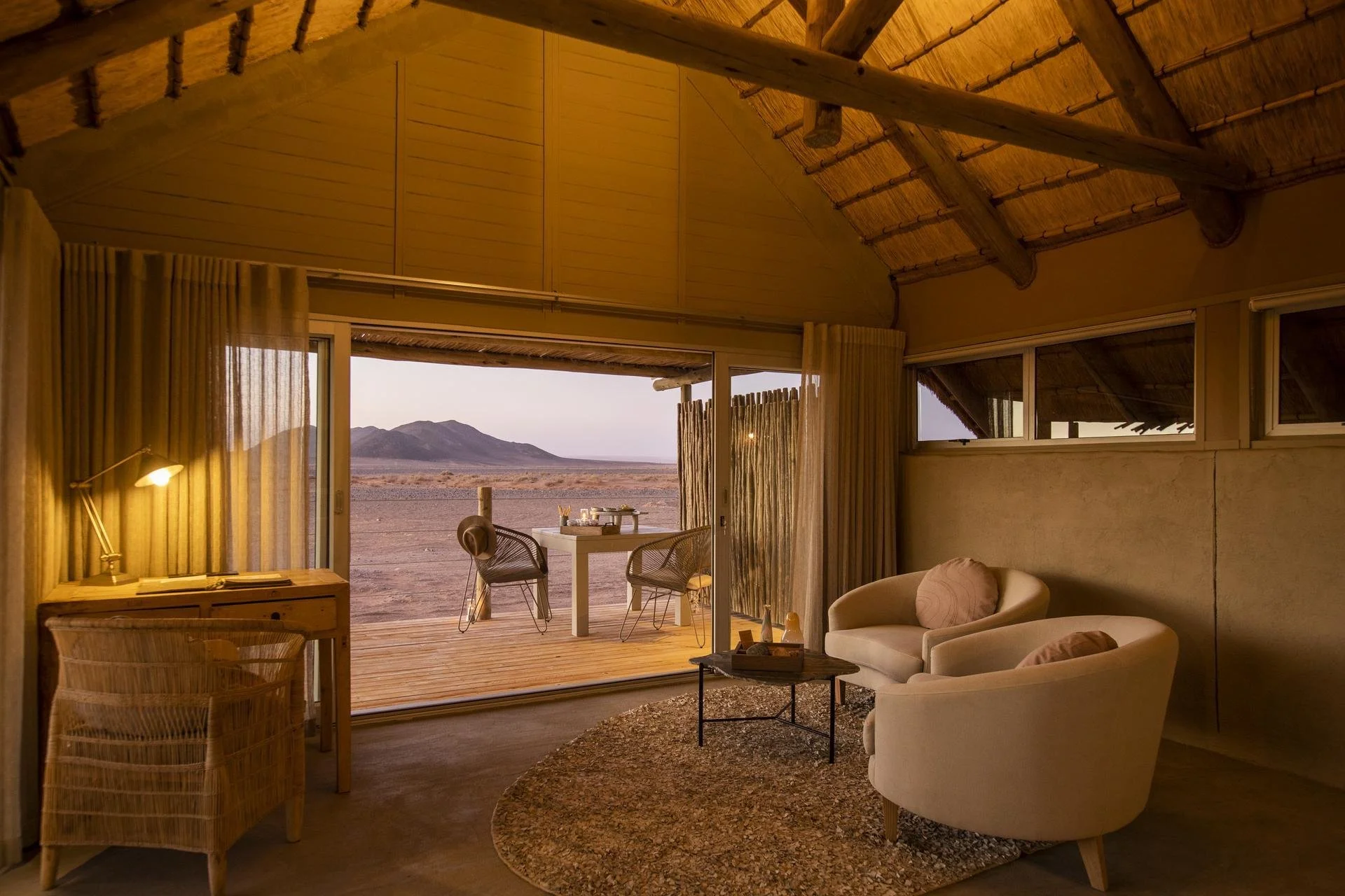 Inspiriert von Dead Vlei wurde das Design der 10 luxuriösen Wüstensuiten geschickt erweitert, um eine verbesserte Luftzirkulation zu bieten, und die Verwendung von Ziegeln und Glas sowie ein Strohdach verbessern die Temperaturregelung weiter. Die Inneneinrichtung spiegelt die natürliche Schönheit der umliegenden Wüste wider, die sich in der Farbpalette und der ausgestellten Kunst widerspiegelt. Jedes Zimmer verfügt über eine geräumige Terrasse, eine Sala und ein privates Tauchbecken, das so konzipiert ist, dass es in die zeitlose Wüstenumgebung einfügt. Ein privater Dachbereich für romantische Sternenbeobachtungen und Schlafmöglichkeiten auf dem Unterdeck jedes Zimmers runden das Erlebnis ab.